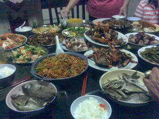 then dinner at grandma's house. the table was full of food. mee goreng (both spicy and non-spicy), stir-fried mixed veg, steamed/black pepper crabs, steamed fish/prawns, deep-fried chicken wings/prawn fritters, lotus root soup, roasted pork/charsiew/duck, sambal veg, mango logcake, riceballs. did i leave any dish out?